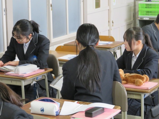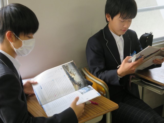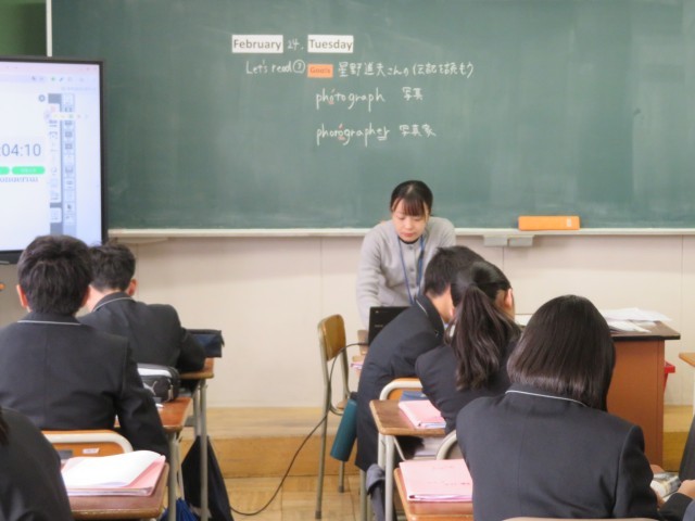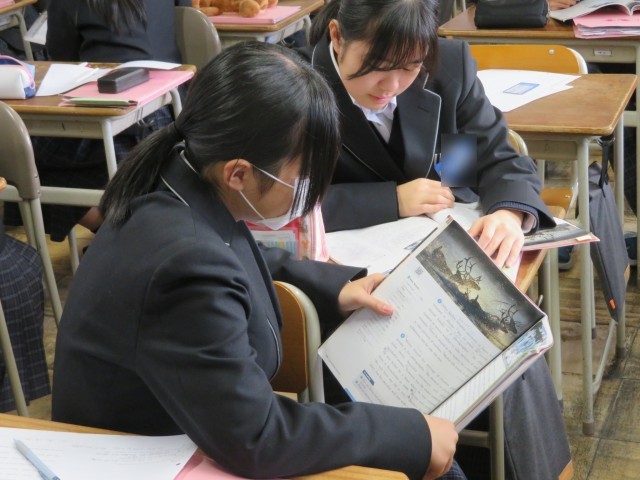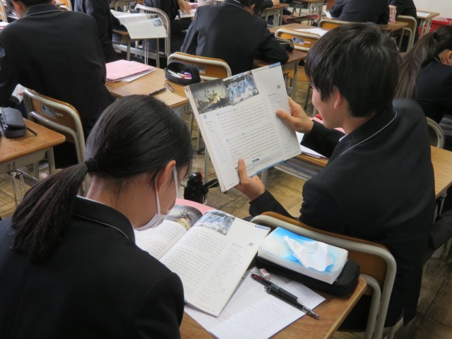 2年生の英語の授業のようすです。「星野道夫さんの伝記を読もう」というめあてで学習を進めていました。長い英文なので、友だちと日本語訳について確認していました。アラスカとの出会いや写真家としての活躍、自然へのメッセージなどについて、内容を読み取ることができましたね。