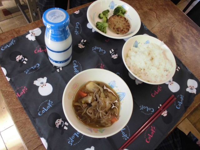 本日の給食は、ご飯、牛乳、肉じゃが、キャベツ入りつくね、ブロッコリーのドレッシング和えです。