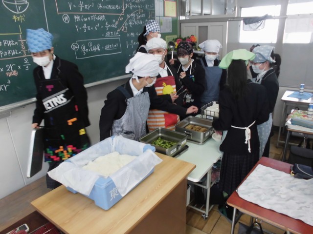 1年生のクラスの様子です。いただきますした後におかわりの生徒がたくさんやってきて大きいおかず等が空になりました。