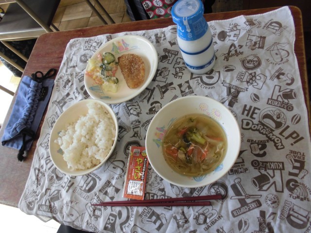 本日の給食は、麦ご飯、牛乳、ボロニアカツ、ポテトサラダ、コンソメスープ、野菜のふりかけです。