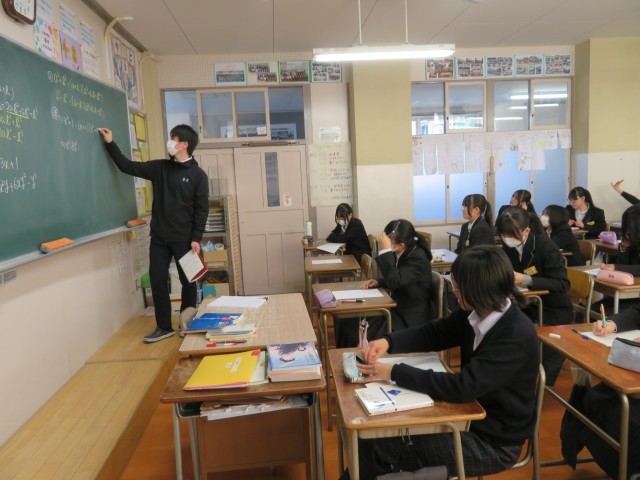 3年生の数学の授業のようすです。「式の展開と因数分解のレベルアップをしよう」というめあてで学習を進めていました。高等学校へとステージを変えても、数学の式の計算の力は必ず必要になります。しっかりと力をつけて進学できるようにという気持ちで頑張っていましたね。