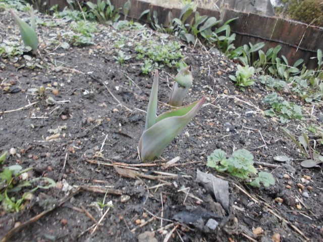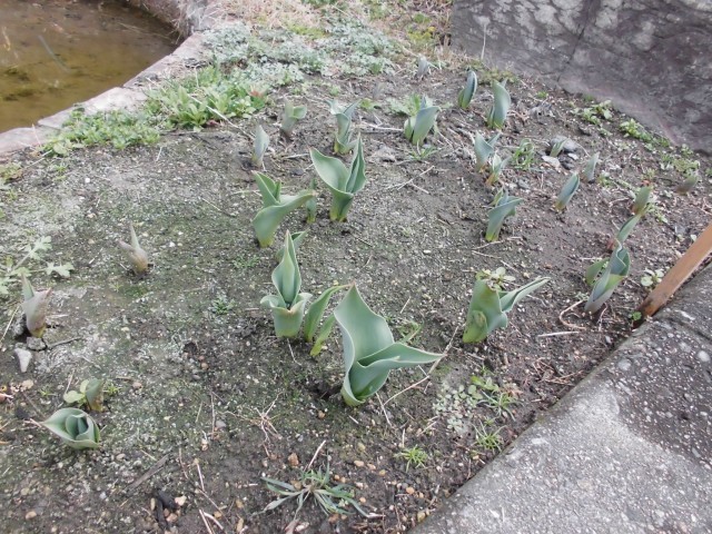 冬に植えたチューリップの球根から芽が出て大きく育ってきました。