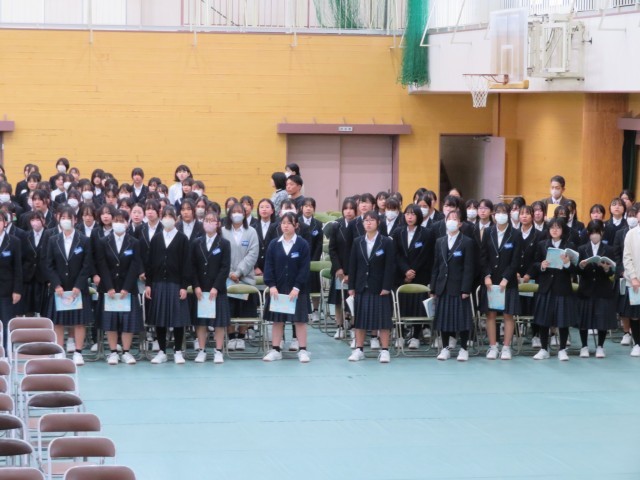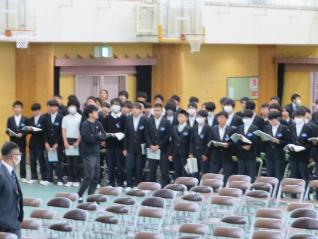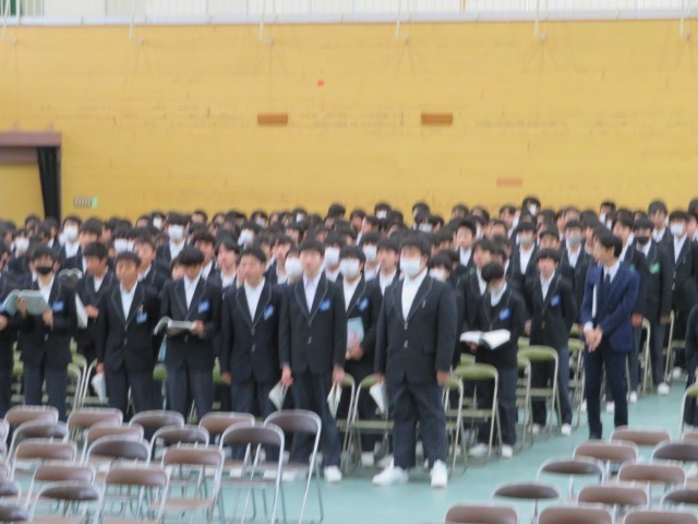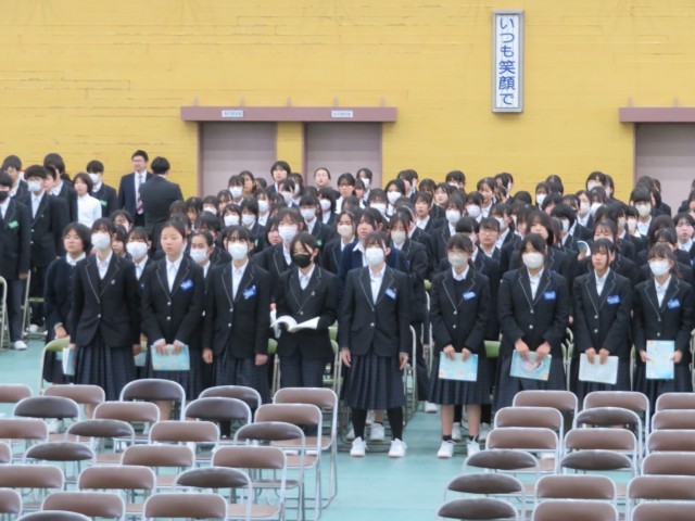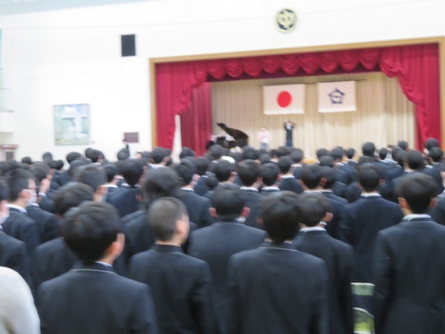 昨日の午後のアリーナに1年生と2年生が集まって合同の音楽を行いました。3月4日(水)は今年度3学年が集まる最後の行事「青桃会(せいとうかい)」があります。そこで2学年が心をひとつに「地球星歌」を歌いあげます。3年生に感謝の気持ちを伝えようと一生懸命歌声と心を合わせていました。すばらしい歌のプレゼントになりそうですね。