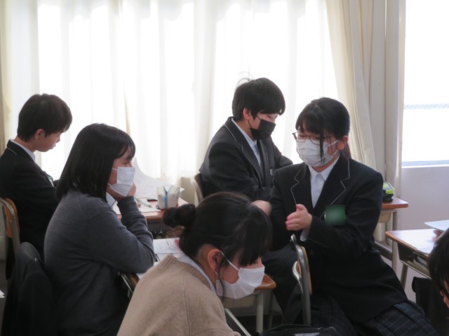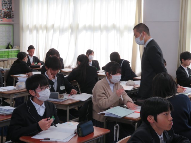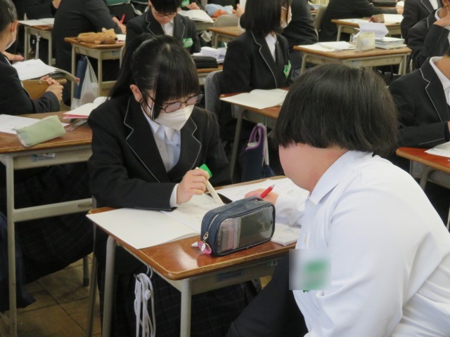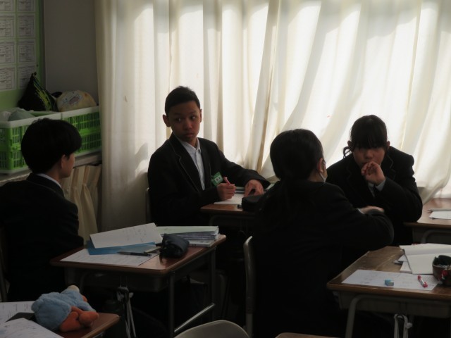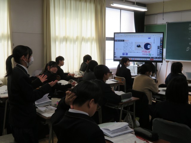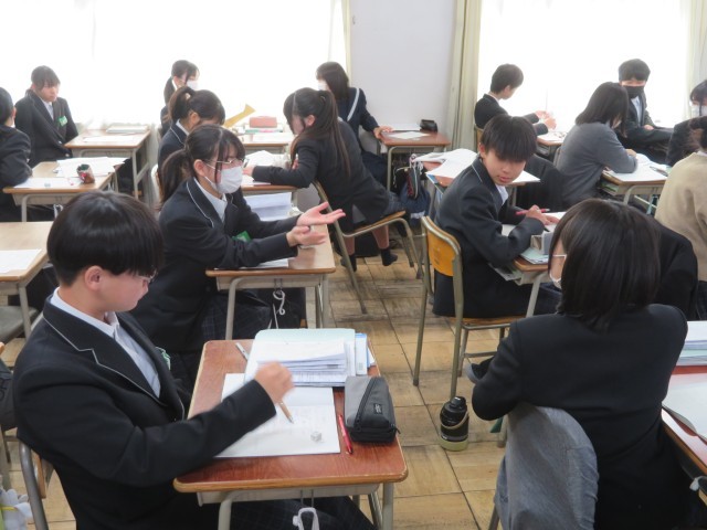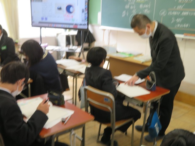 1年生の数学の授業のようすです。平らでなく、展開図も描けないような球の表面積は、どうやって表せるのだろうか?という問いにみんなで取り組んでいました。