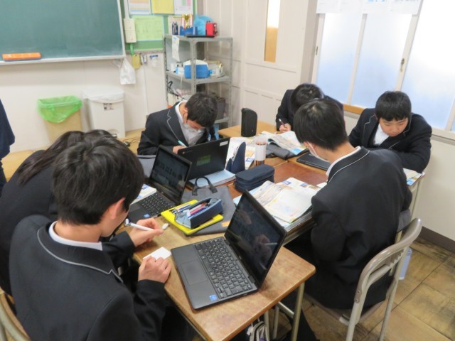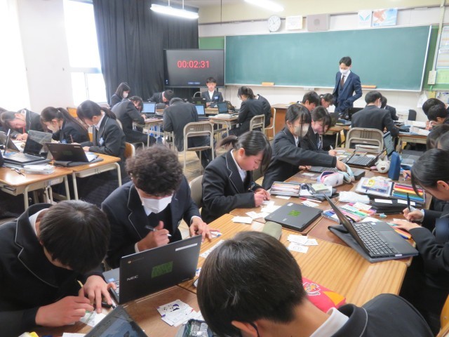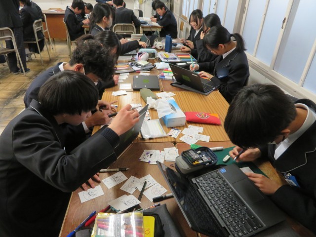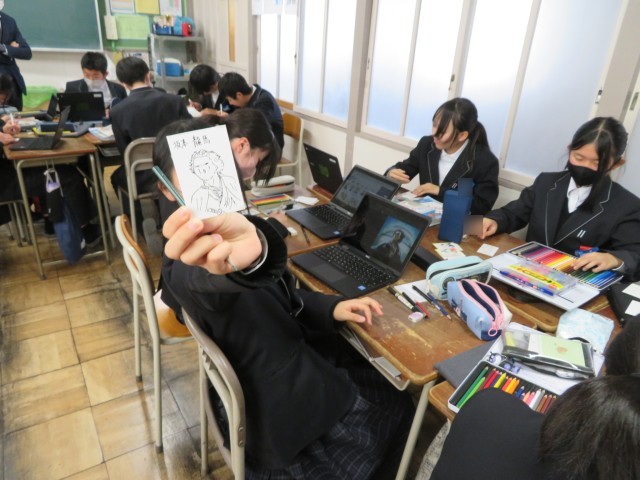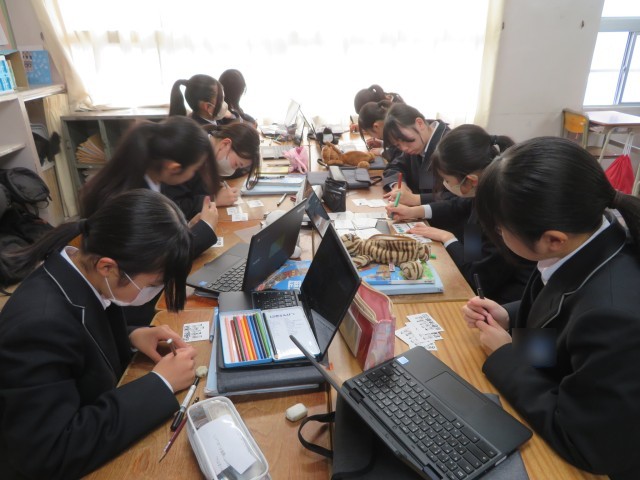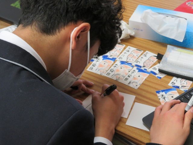 2年生の社会の授業のようすです。これまでの学びをカードに落とし込んで、楽しみながら理解を深めようと、グループで協力してカードづくりに取り組んでいました。歴史上の人物の名前はもちろん、顔やきていたものの特徴までしっかりと覚えられそうですね。