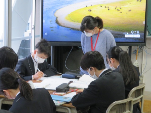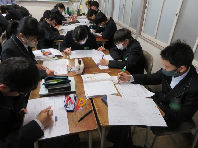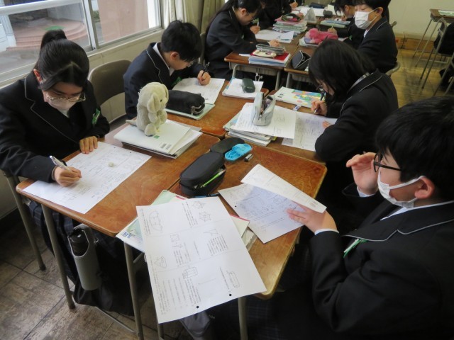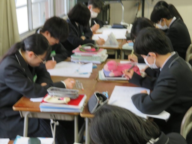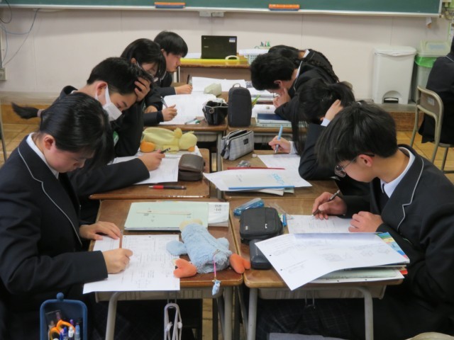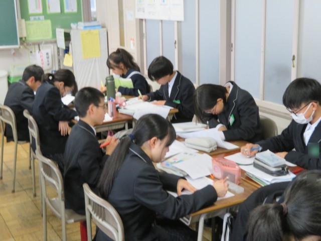 1年生の数学の授業のようすです。章末問題のプリントを使って「空間図形の学びをたしかめよう・学びを身につけよう」というめあてで学習を進めていました。じっくりと問題に向き合って自信を深めることができましたね。