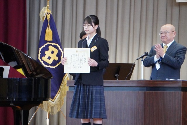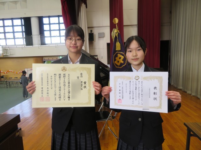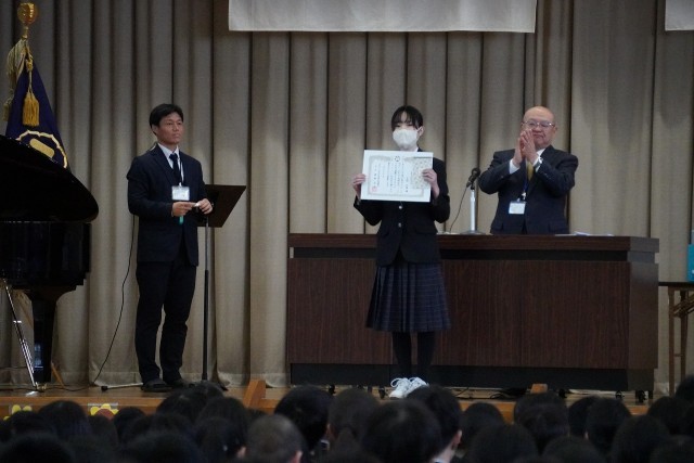 卒業式の予行練習の後、全校集会で表彰伝達を行いました。今回受賞したのは次の賞を受けた生徒です。全校生徒と職員から大きな拍手を送られました。おめでとうございます。