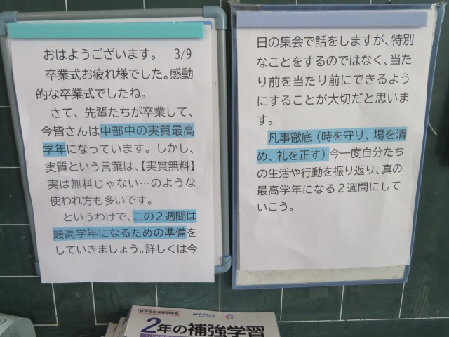 3月9日(月) 本物の最高学年になるために【2年黒板メッセージ】