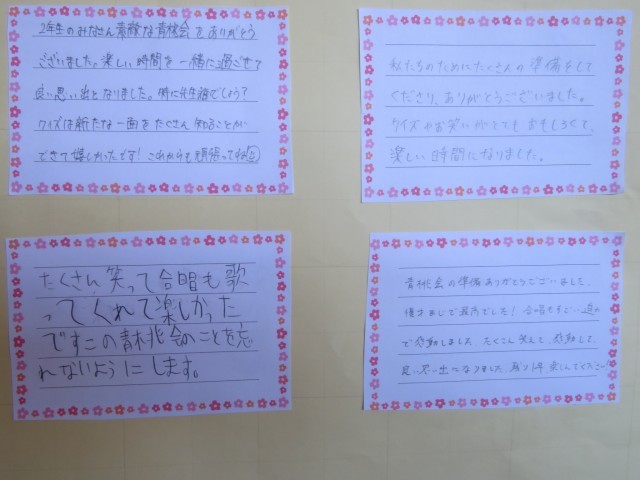 ◇2年生のみなさん素敵な青桃会をありがとうございました。楽しい時間を一緒に過ごせて良い思い出となりました。特に先生誰でしょう?クイズは新たな一面をたくさん知ることができて嬉しかったです!これからも頑張ってね☺