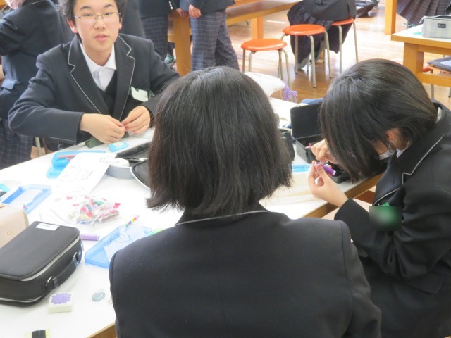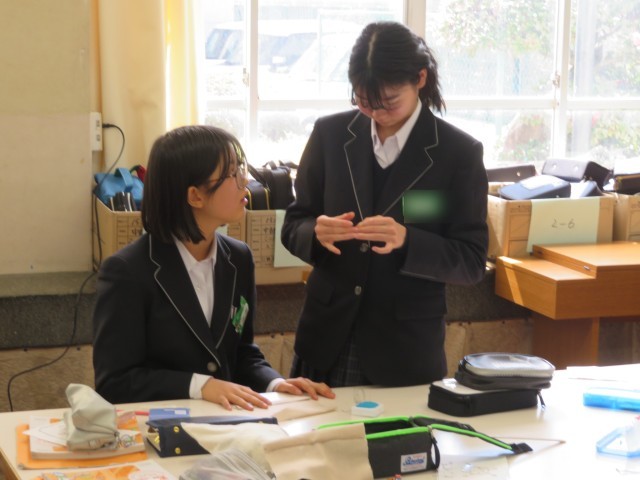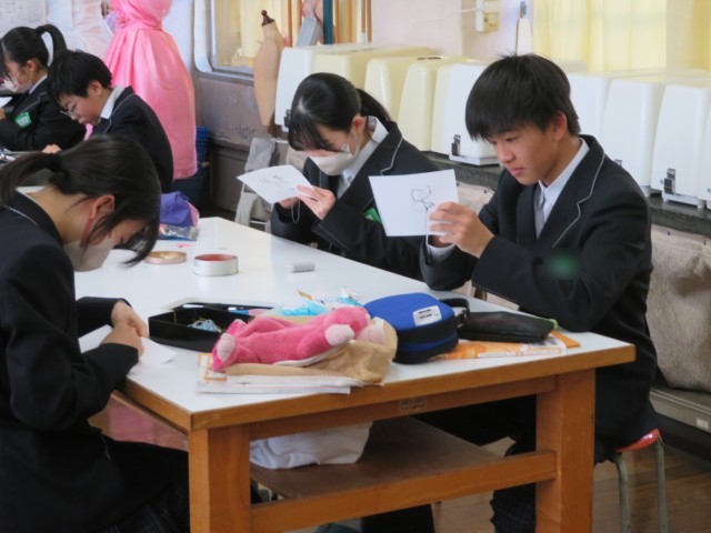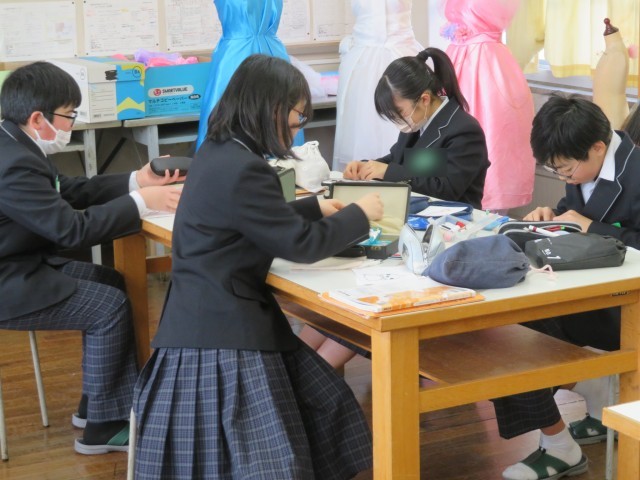 1年生の家庭科の授業のようすです。「学んだことを生かしてメッセージカードをつくろう」というめあてで学習を進めていました。運針や止めの技術をフル活用して、文字やイラストを丁寧に浮き上がらせていました。もらった人はきっと喜びますよ(^^)/
