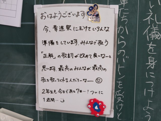 3月12日(木) 「正解」の歌詞に思いを込めて【2年黒板メッセージ】 公開日 2026/03/12 更新日 2026/03/12 人権教育といじめ対策 担任の先生からのメッセージです(^^)/ 2年 全学年