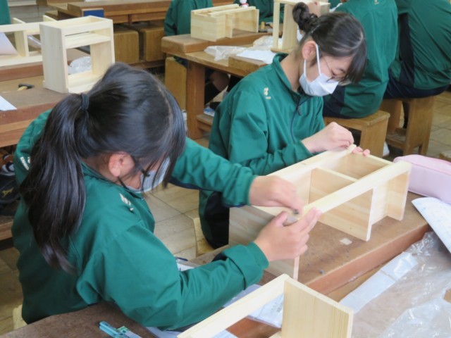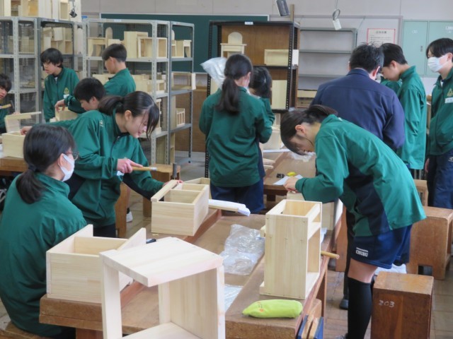 1年生の技術の授業では、現在「製品を仕上げよう」という目標のもと、木工制作に取り組んでいます。写真は昨日の授業のようすです。