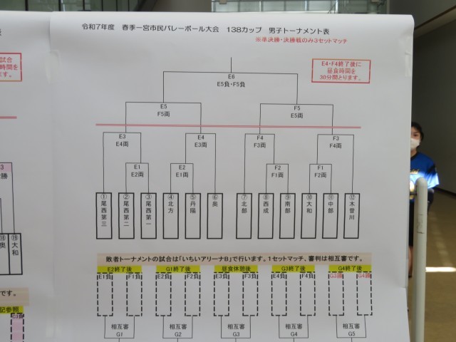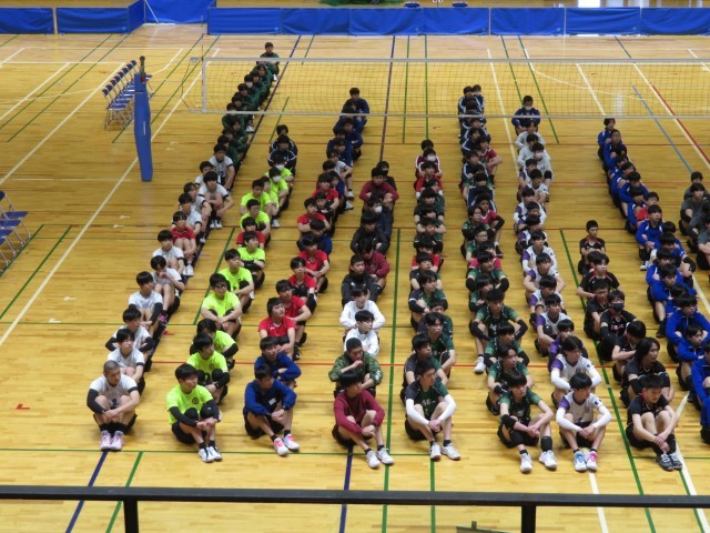 バレーボール部は総合体育館で開催されている春季一宮市民大会に出場しています。写真は、開会式の様子です。仲間から大きな声援を受けて、コートいっぱいに躍動していました。市内のチームを相手に日ごろの練習の成果を発揮して、自信と課題をつかむ大会になることを応援しています。