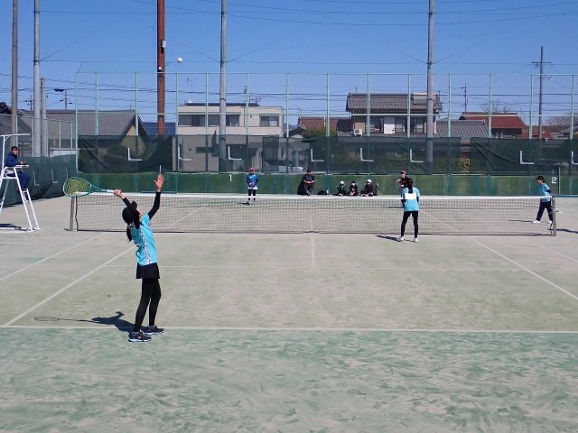 新人大会以来の大会で、どのペアも久しぶりの大会の雰囲気に緊張していたようでした。結果としては4校の予選リーグの中で3位となり、予選リーグ敗退となりました。しかし、どのペアも強豪校相手に粘ることのできたゲームが多かったように思います。冬に培ってきた成果が出せた部分もあり、相手のレベルの高いプレーから見つかった課題もありました。一宮市内だけでなく、他地区の強豪校とのリーグだったからこそ、学ぶものが多く、貴重な経験ができたと思います。また、1・2年生の応援席からの大きな声援が選手の力になり、チーム全員で戦うことができていました。チームとしても、個人としても実りのある大会でした。今大会の成果・反省を生かして、春の大会に向けてまた練習に励んでいきましょう。