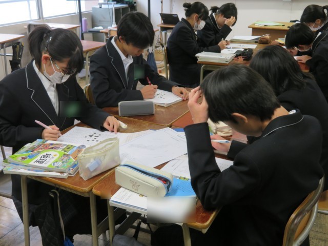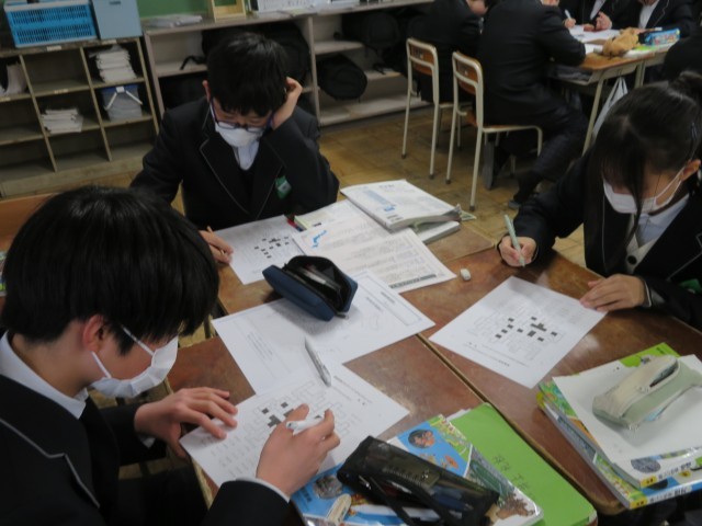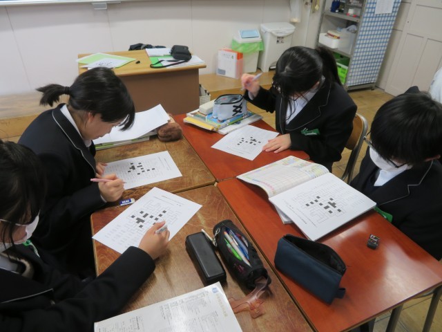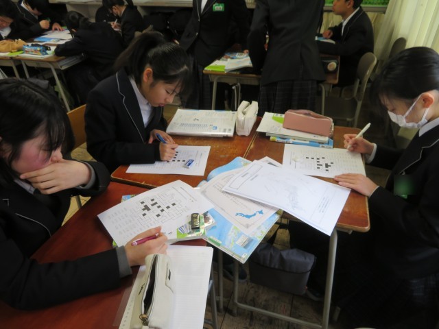 1年生の社会の授業のようすです。「都道府県宝探し」のプリントに挑戦していました。19のヒントを基に、宝の場所を見事発見することができたでしょうか。後半は都道府県クロスワードパズルにチャレンジしました。楽しみながら地理の理解を深めることができましたね。
