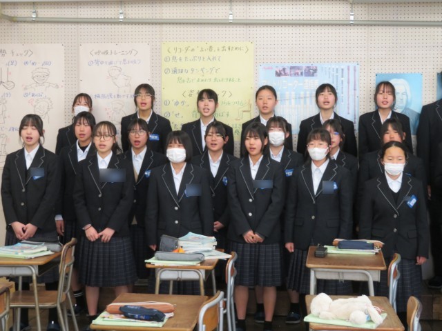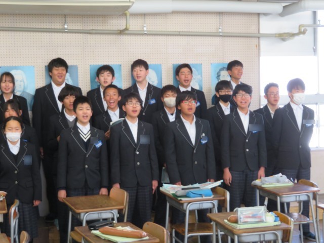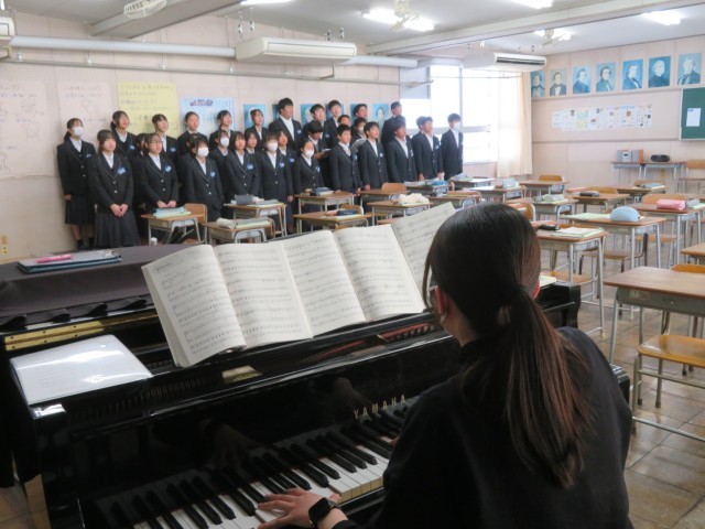 2年生の音楽の授業のようすです。クラス合唱「旅立ちの日に」を歌いあげていました。この1年間で、すばらしい表現力を身につけてくれました。3年生の合唱も楽しみにしていますよ!(^^)!
