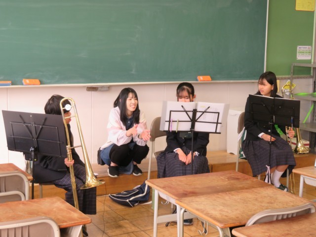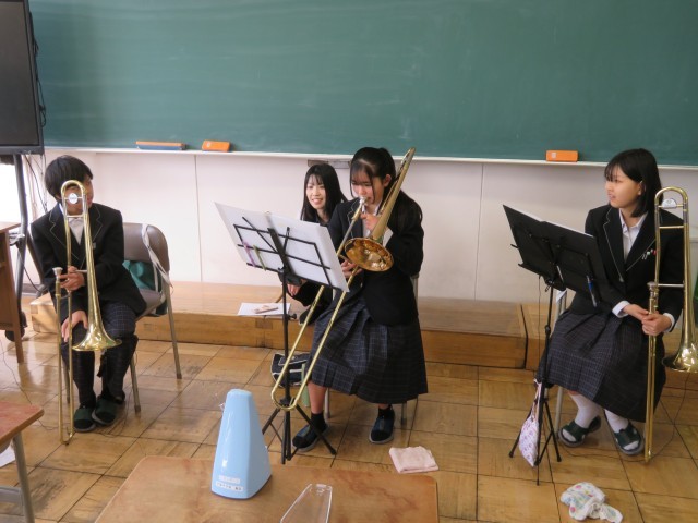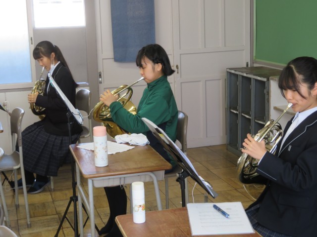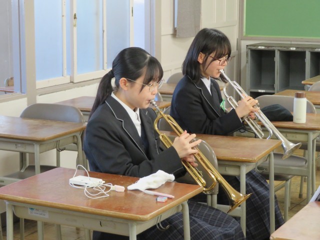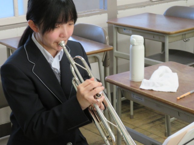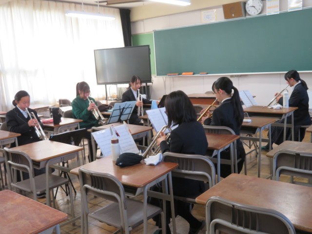 吹奏楽部の今日の練習のようすです。「夕映えの丘」の曲についてパート練習に取り組んでいました。