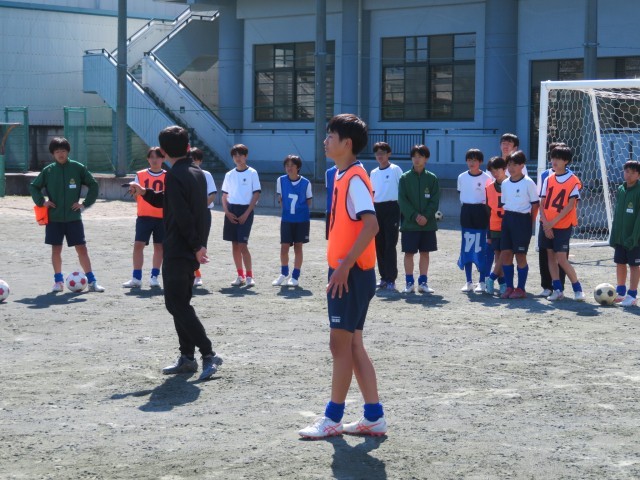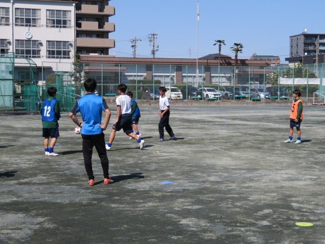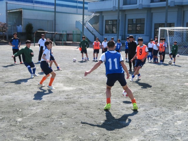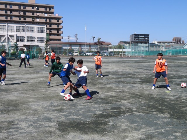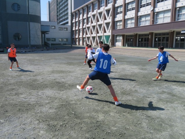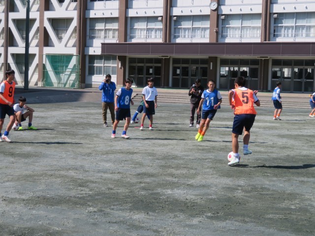午後のグランドのようすです。サッカー部がICCの取材を受けながら練習に励んでいました。速いテンポでボールを動かしながらつなぐ練習では、メンバーを何度も入れ替えながら、チーム全体のレベルを上げられるようにがんばっていました。