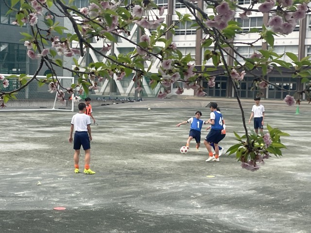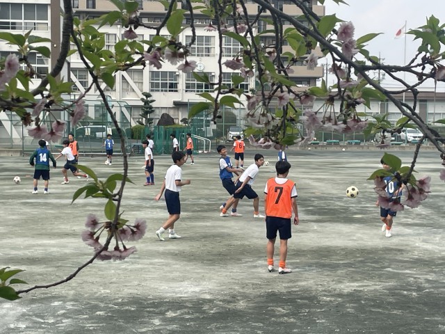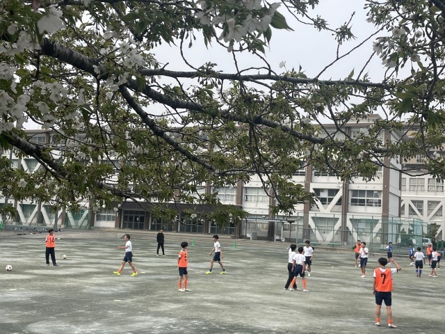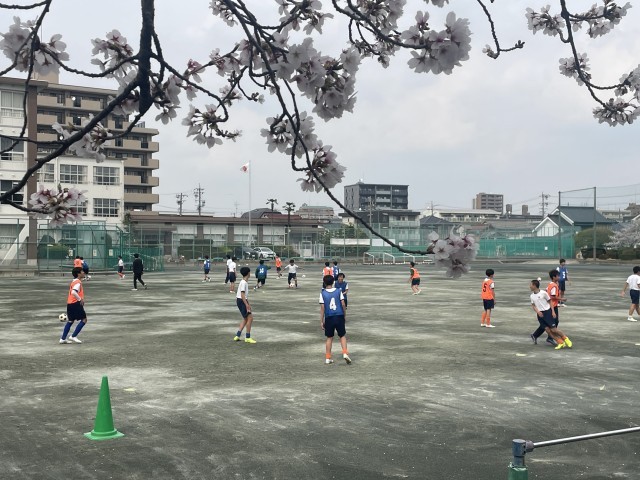 昨日は、春休み中の多くの部活動にとって、チーム全体で集まって活動するひとつの区切りの日となりました。写真は昨日のグランドのようすです。満開に近い桜のもと、元気にボールを追うサッカー部の姿がありました。この活気は、中部中すべての部活動のエネルギーを象徴しています。