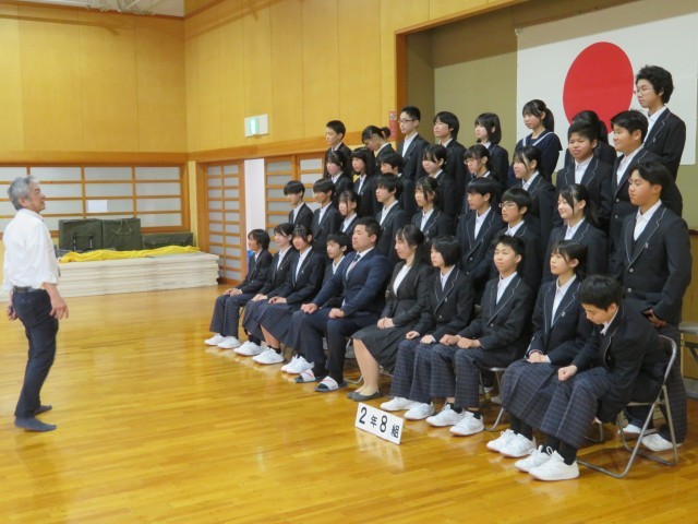 2年生の学級写真のようすです。始業式後に武道場で「ハイチーズ!」出会いの記念になる写真を笑顔いっぱいでとることができましたね。