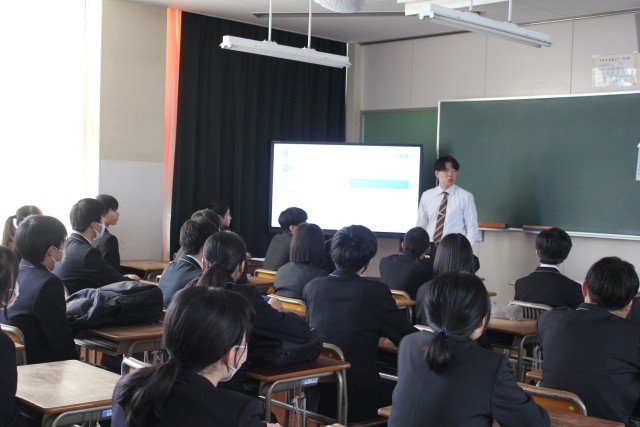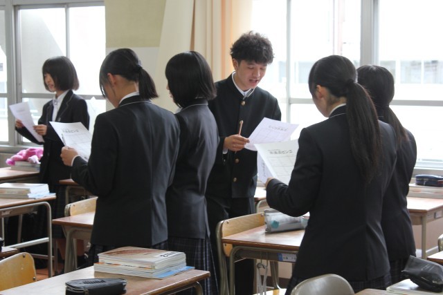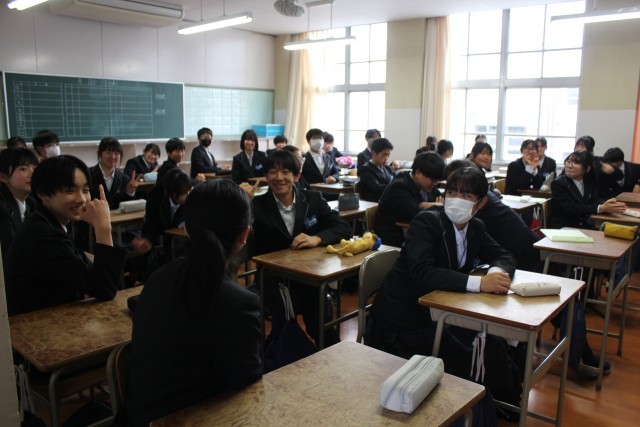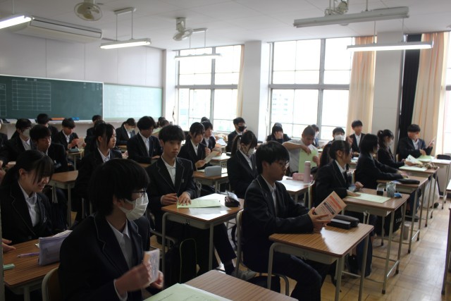 3年生の始業式後の学級活動の様子です。担任の所信表明を聞いている様子や、アイスブレイクで自己紹介型のアクティビティをしているクラス、配付物を確認しているクラスなどさまざま姿がありました。