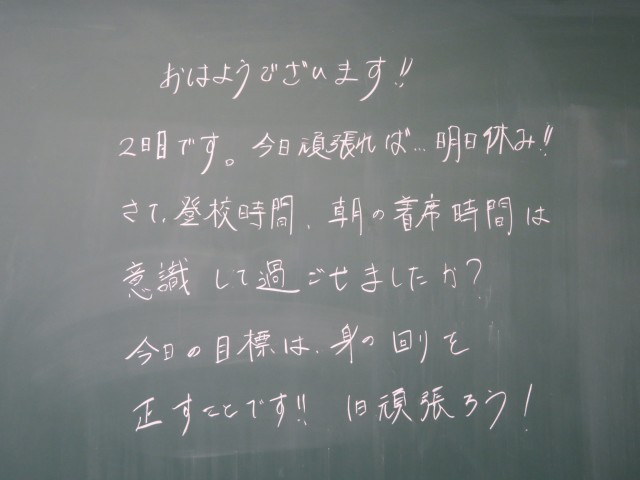 4月10日(金) 凡事徹底をひとつずつ(^^)/【1年黒板メッセージ】 公開日 2026/04/10 更新日 2026/04/10 人権教育といじめ対策 担任の先生からのメッセージです(^^)/ 1年 全学年