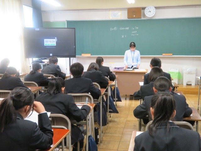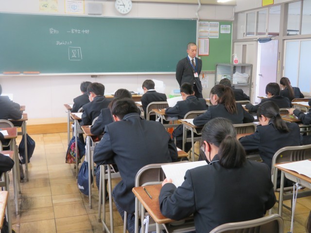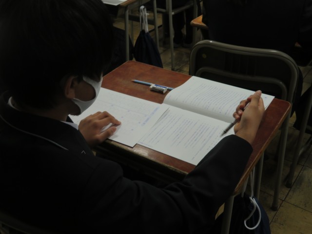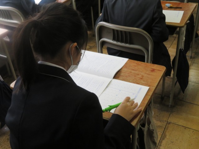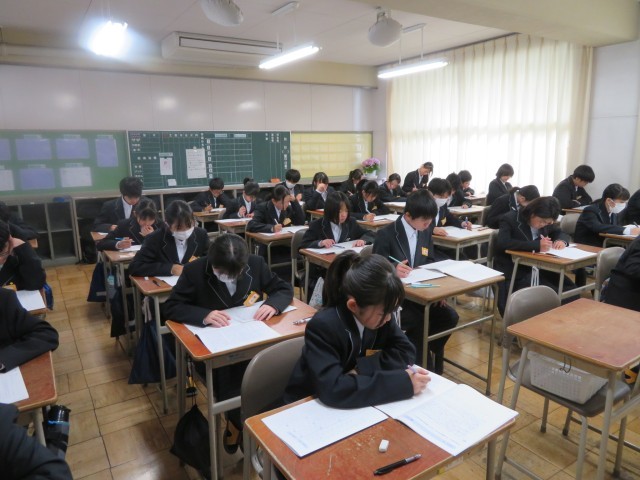 写真は1年生の教室です。聞こえてくるのは鉛筆が紙を走る音と、ページをめくる音だけ。どの生徒も、目の前の問題用紙にじっくりと向き合い、一字一句を丁寧に読み解こうとする気迫が伝わってきました。