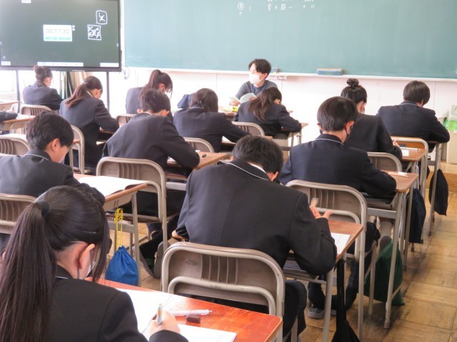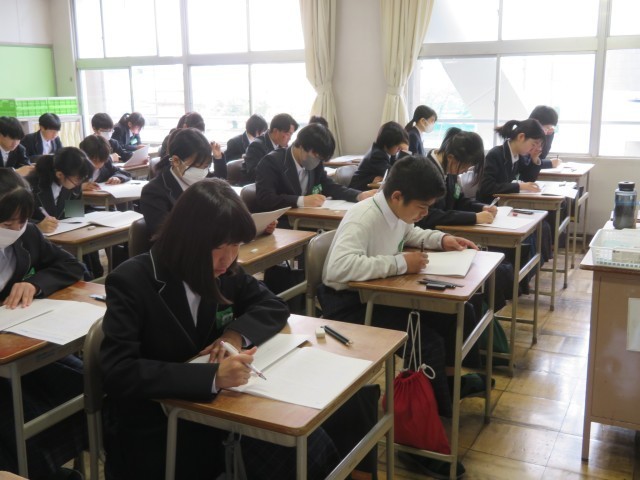2年生の教室では、昨年度からの積み重ねを感じさせる、非常に落ち着いた雰囲気の中でテストが行われました。