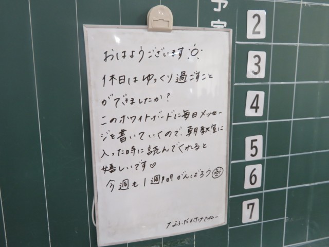 4月13日(月) 毎日のメッセージが楽しみですね【1年黒板メッセージ】 公開日 2026/04/13 更新日 2026/04/13 人権教育といじめ対策 担任の先生からのメッセージです(^^)/ 1年 全学年