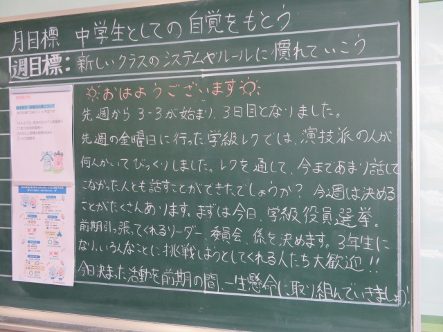 4月13日(月) 「挑戦」大歓迎です(^^)/【3年黒板メッセージ】 公開日 2026/04/13 更新日 2026/04/13 人権教育といじめ対策 担任の先生からのメッセージです(^^)/ 3年 全学年