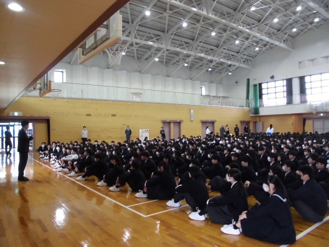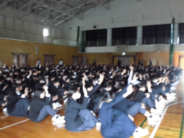 2枚目、3枚目は5時間目にアリーナで行われた全学年の生活と安全についての話を聞いている様子です。
