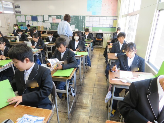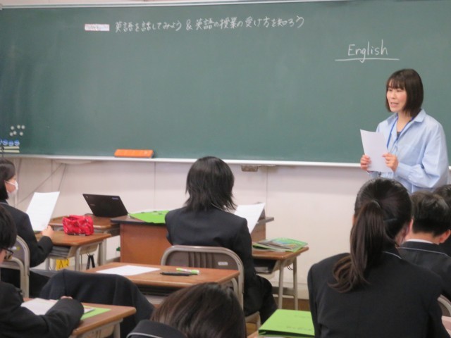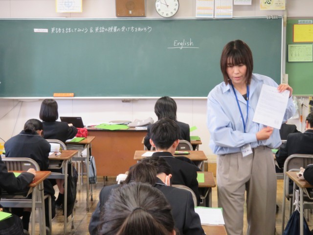 1年生の英語の授業のようすです。「英語で話してみよう&英語の授業の受け方を知ろう」というめあてで学習を進めていました。
