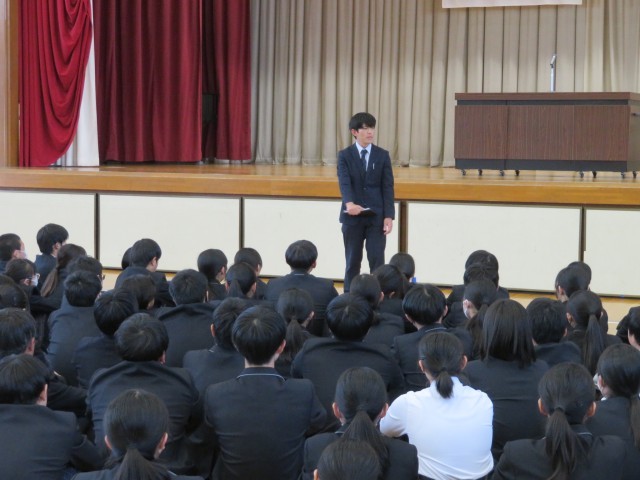 一年生の皆さんは、中学校での生活に、なれましたか。緊張の毎日が続いていると思います。早く中部中学校のルールを覚えて、行動できるように応援しています。また、23年生の皆さんは、先輩として、ルールをしっかり守るという姿、当たり前のことを当たり前に進めていくたくましい姿を、一年生のみなさんに手本として示してあげてください。それが、先輩として、だれもができる一年生へのサポートです。よろしくお願いします。