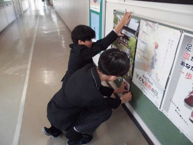 広報委員会の仕事は、給食と清掃の放送といろんなポスターの掲示です。
