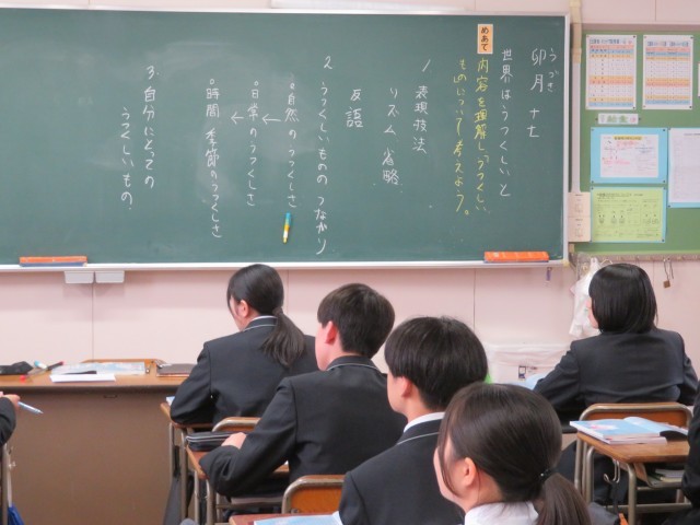 3年生の国語の授業のようすです。「内容を理解して『うつくしいもの』について考えよう」というめあてで学習を進めていました。教科担任の先生からは、通勤のときに感じたうつくしい風景について紹介がありました。みなさんは、どんなものをうつくしいと感じましたか?