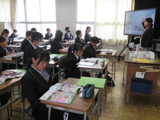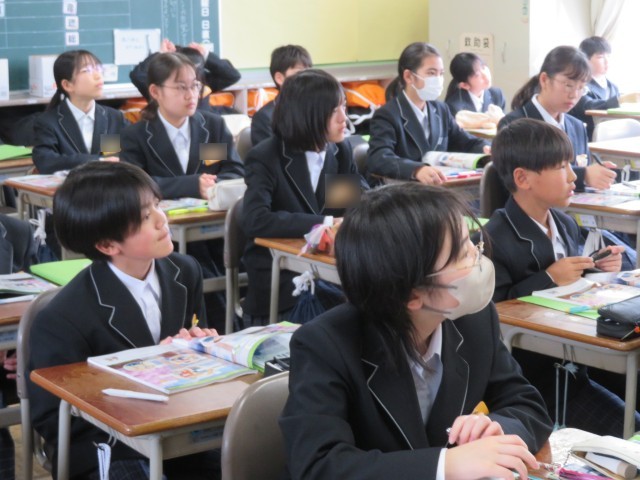 1年生の昨日の英語の授業のようすです。みんな真剣な表情で教科担任の先生のお話に聞き入っていましたね。学ぶ姿勢がとても素敵でしたよ!(^^)!