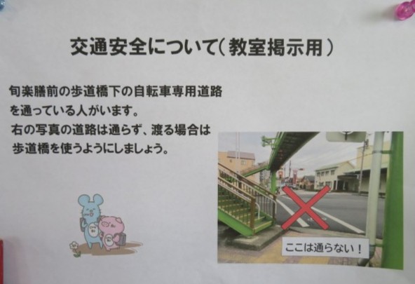 4月18日(土) 交通ルールをまもりましょう! 公開日 2026/04/18 更新日 2026/04/18 コミュニティ・スクール 教室に交通安全を呼びかける掲示物がありました。この写真の場所は自転車専用の渡り場所です。急いでいるときもここを横断歩道代わりにしてはいけません!歩道橋を渡って横断するようにしましょう! 1年 2年 3年 全学年