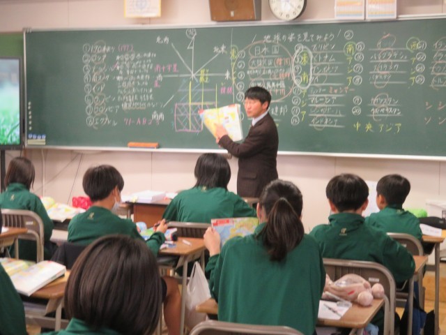 1年生の社会の授業のようすです。「地球の姿を見てみよう」というめあてで学習を進めていました。日本を飛び出して、世界を意識しながら地球の姿をイメージすることができましたね。