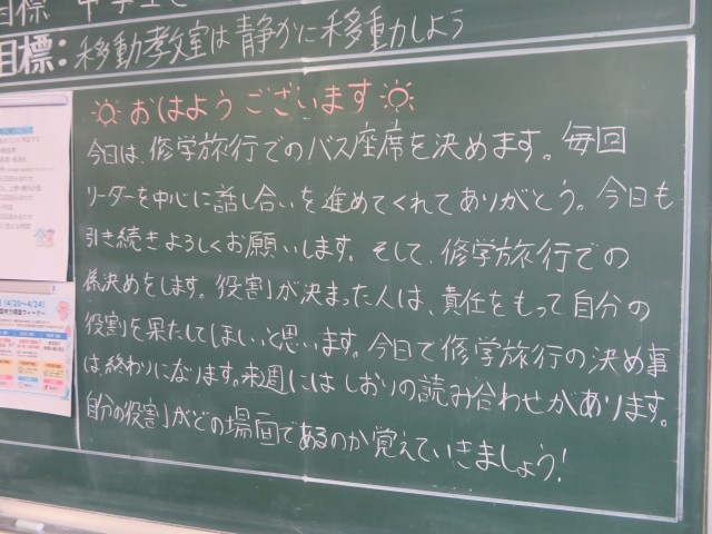 4月23日(木) 責任をもって役割を果たしていこう【3年黒板メッセージ】 公開日 2026/04/23 更新日 2026/04/23 人権教育といじめ対策 担任の先生からのメッセージです(^^)/ 3年 全学年