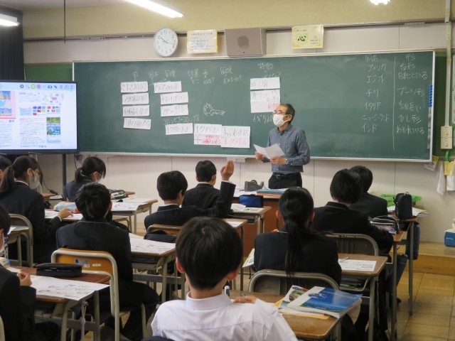 1年生の社会の授業のようすです。世界にはどのような国々があるのでしょうか。「国名や国旗、位置や形などに着目して調べてみよう」というめあてで学習を進めていました。先生の楽しいお話に笑顔が広がっていましたね。
