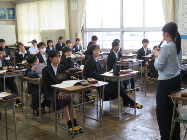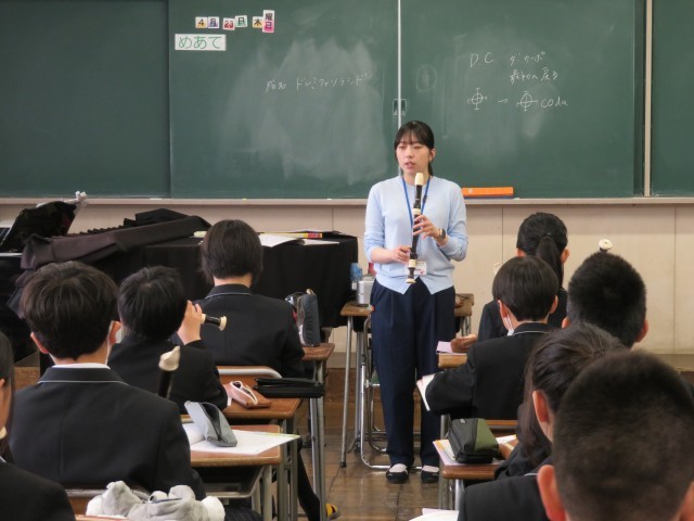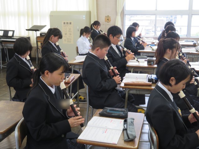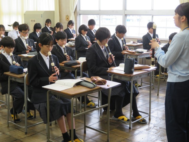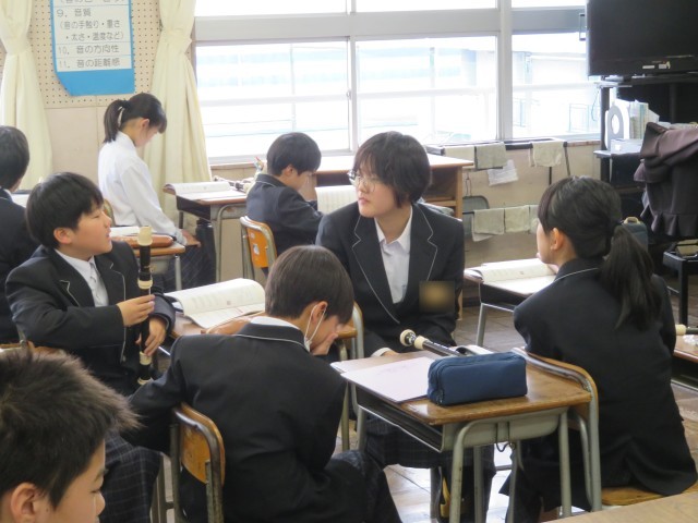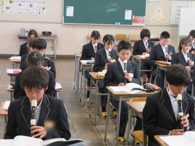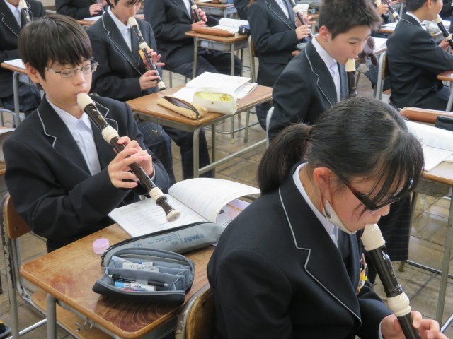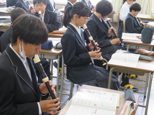 1年生の音楽の授業のようすです。アルトリコーダーの演奏に挑戦していました。タンギングありとなしではどのように表現が違うのか確認した後、タンギングを使ってなめらかに音を出す練習をしました。音楽室がすてきな音色に包まれましたね。