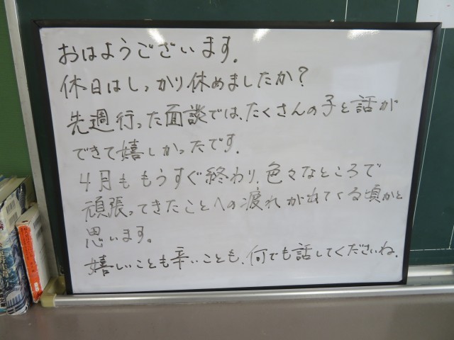 4月27日(月) お話たくさん聞けるのを楽しみにしています【1年黒板メッセージ】