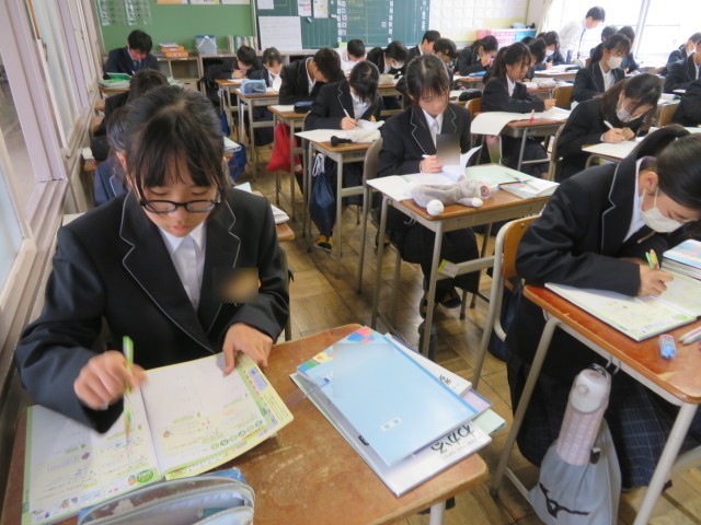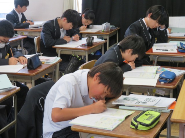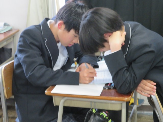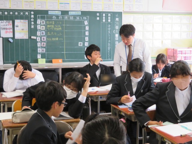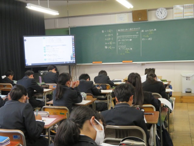 1年生の数学の授業のようすです。「数直線を使って数を求めよう」というめあてで学習を進めていました。「大きい」や「小さい」は数直線上ではどのような意味になるのか考えながら、求める数がいくつになるのか説明することができましたね。