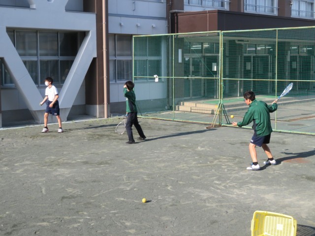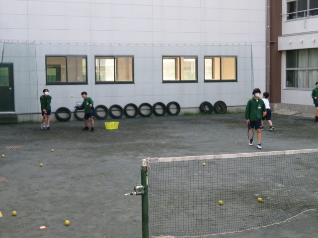 アリーナと中庭テニスコートのようすです。たくさんボールに触れられるように積極的に体を動かしていました。イメージ通りにボールを操ることができたかな。