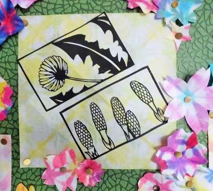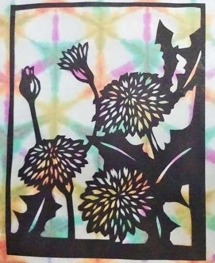 カラフルな台紙は、和紙を折り染めしたものです。この台紙も先生たちが染めたものです。カラフルな台紙が黒い切り絵にあっていますね。
