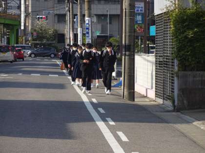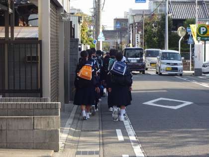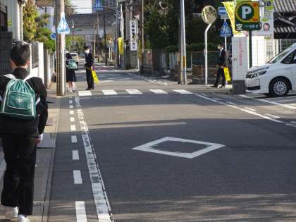 学校の東側の道路は、ちょうど登校する時間帯は車の交通量が大変多いです。白線からはみ出さないように登校してくださいね。