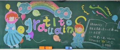中部中学校美術部生徒が、新入生のために春休み中に作成した黒板アートです。