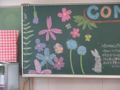 4月7日(水)の朝、新入生が教室に入って、「中部中学校に入学してよかった。これからこの中部中学校で頑張っていこう。」と思ってくれるように、心を込めて描きました。