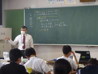 2年生の社会の授業の様子です。今日は、世界の人口がどのように分布し、どのような問題があるのかを勉強しました。