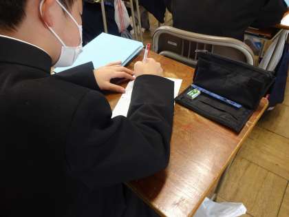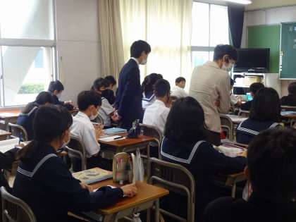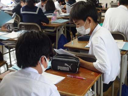 自分の考えをしっかりと持って、アウトプットできることをめざしています。先生も机間指導をしてアドバイスをしています。